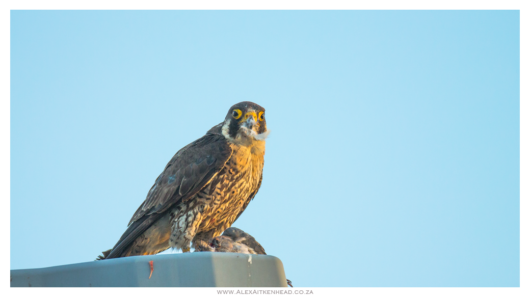 On my way to the Strandfontein Sewer Works, we bumped into this ringed Peregrine Falcon enjoying breakfast on the lamp post above. Picture taken in Sunset Beach, Milnerton Cape Town.